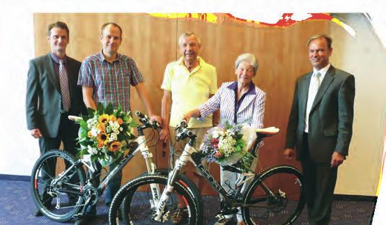 Bei der gleichen Sonderverlosung haben zwei weitere Gewinnsparer wertvolle Sachpreise ge-wonnen. Jeweils ein GHOST Mountainbike ge- wannen Stephan Rist und Pia Thomas. Mit den Gewinnern freuen sich Ehemann Alfred Thomas Mitte) zusammen mit den Kundenberatern Thomas Bierenstiel (li.) und Hermann Fisel.
